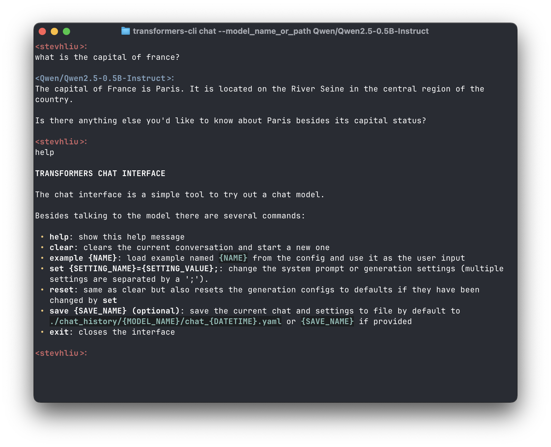 After you’ve installed Transformers, you can chat with a model directly from the command line. The command below launches an interactive session with a model, with a few base commands listed at the start of the session.
