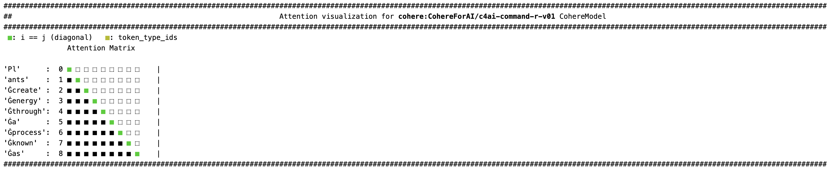 # format message with the Command-R chat templatemessages = [{"role": "user", "content": "How do plants make energy?"}]input_ids = tokenizer.apply_chat_template(messages, tokenize=True, add_generation_prompt=True, return_tensors="pt").to(model.device)output = model.generate( input_ids, max_new_tokens=100, do_sample=True, temperature=0.3, cache_implementation="static",)print(tokenizer.decode(output[0], skip_special_tokens=True))Use the AttentionMaskVisualizer to better understand what tokens the model can and cannot attend to.